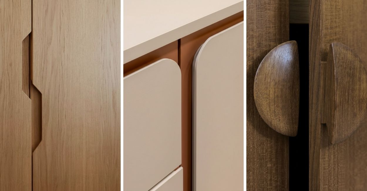 É um recurso pequeno, mas com impacto desproporcional. Aliás, o canto arredondado da abertura contribui para uma leitura mais orgânica, que dialoga muito bem com a tendência atual de formas curvas na marcenaria contemporânea.