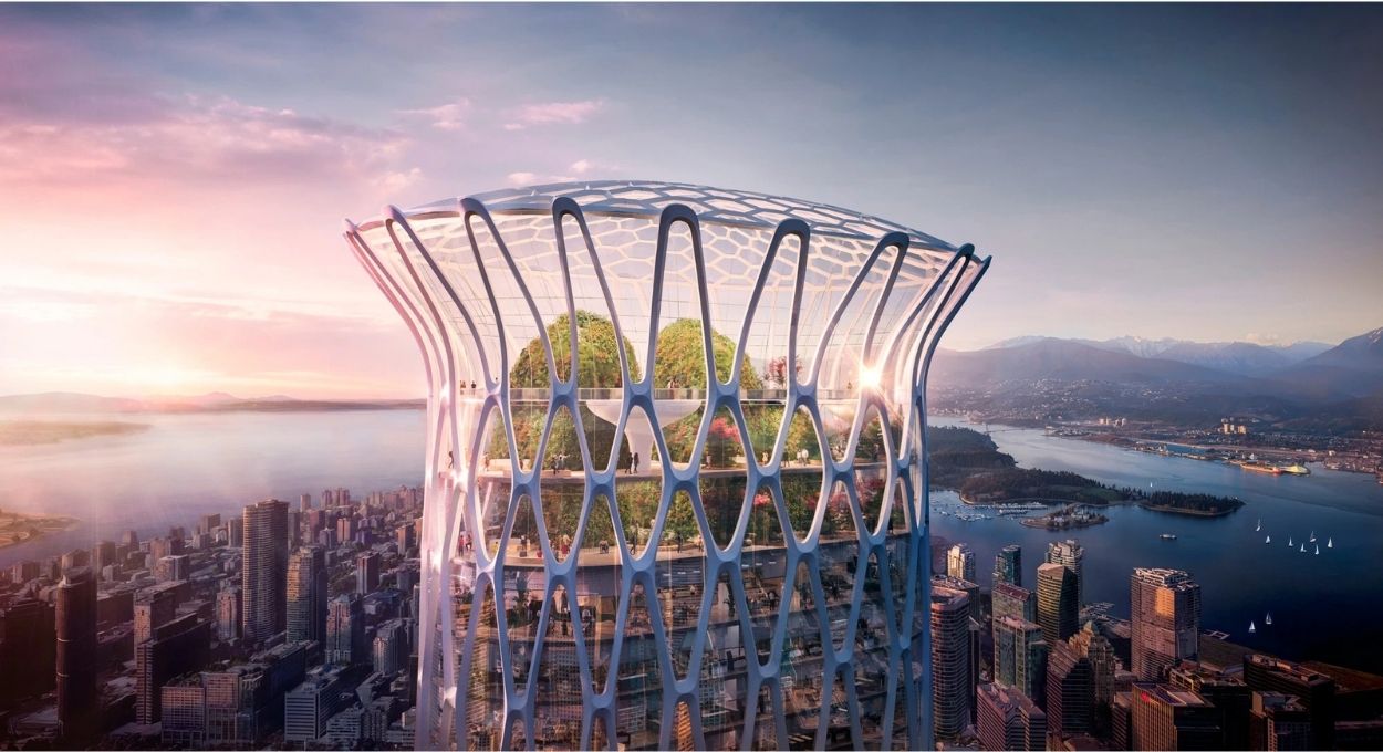No arranha-céu de Vancouver, essa lógica se transforma em arquitetura. A estrutura externa do edifício recebe um padrão geométrico inspirado diretamente nas esponjas, formando uma espécie de exoesqueleto que envolve a torre. Esse sistema não é decorativo. Ele distribui as cargas de vento e peso próprio de maneira mais equilibrada, permitindo que os espaços internos sejam mais livres, sem colunas atravancando a planta. Dessa forma, há ganho real em área útil e flexibilidade para futuros usos.