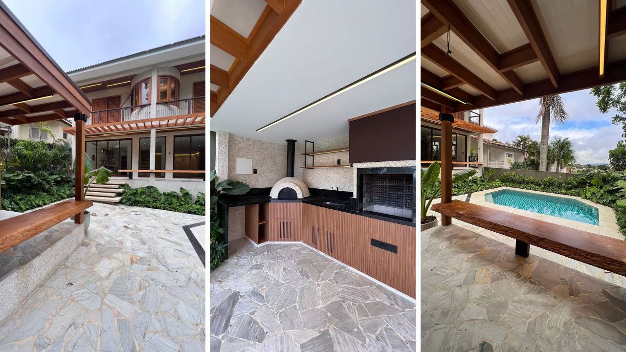 A área gourmet, voltada ao encontro e aos momentos de lazer, reafirma a mesma sensibilidade estética presente em todo o projeto. O conjunto formado por forno de pizza, churrasqueira e painéis ripados de madeira cria uma atmosfera calorosa, pensada para acolher famílias e amigos. Nada é excessivo; tudo é funcional e esteticamente equilibrado.
