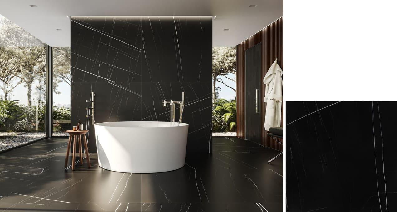 O fundo negro com veios brancos marcantes e intensos do mármore Nero-Caressi deu origem a série homônima da Roca Cerámica. Seu SuperFormato 120 x 250 cm permite aplicações em bancadas, entre outros projetos de movelaria | Fotos: Divulgação