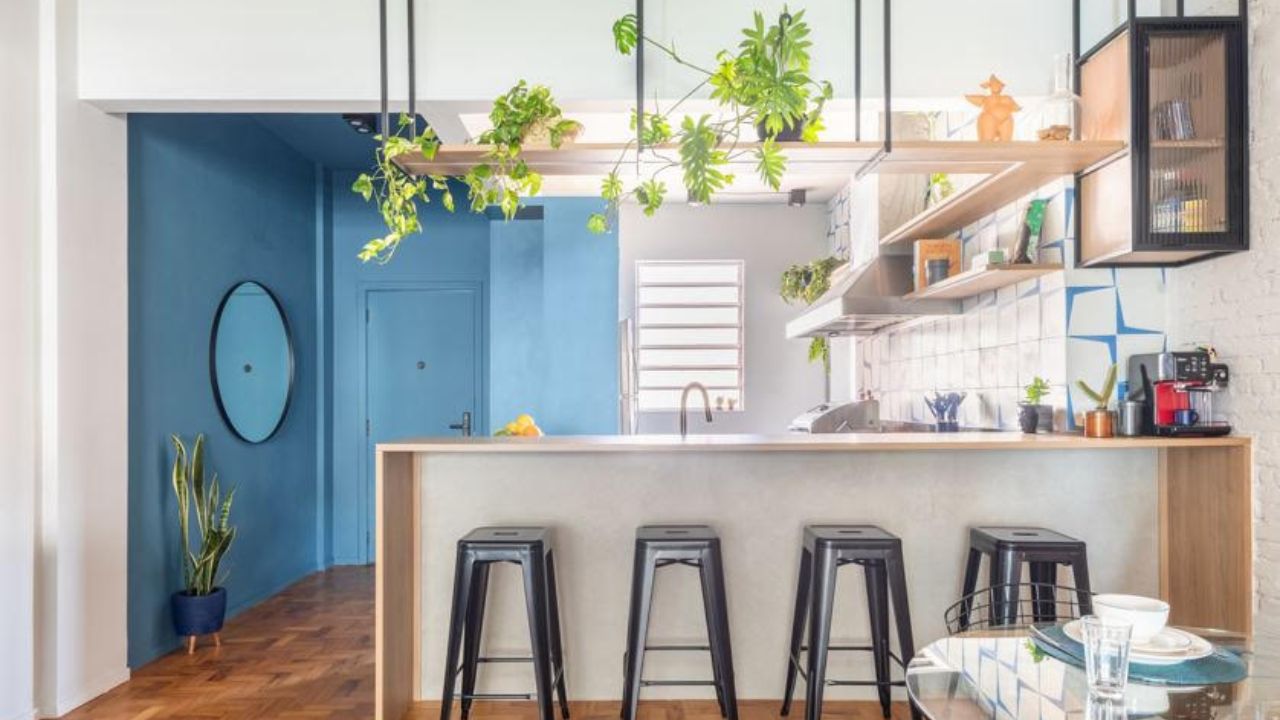 O ladrilho hidráulico no revestimento adiciona textura e cor, enquanto o MDF azul dos armários reforça a identidade da paleta de cores do projeto | Projeto BMA Studio | Foto: Guilherme Pucci