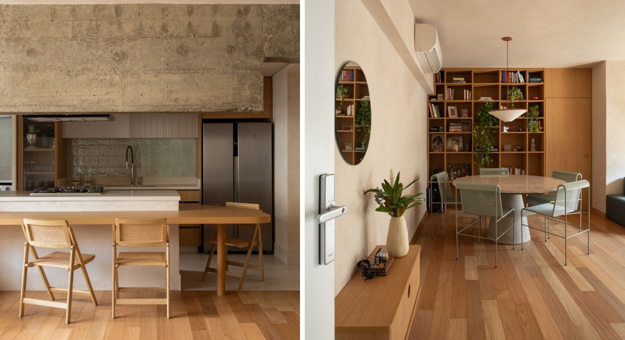 O resultado é um apartamento de 110 m² que, ao primeiro olhar, sugere calma. As superfícies evocam a textura da areia, os tons terrosos dominam a paleta e a madeira aquecida aparece como fio condutor de todos os ambientes. Não é uma decoração decorativa. É uma decisão projetual: criar um espaço que desacelere quem entra nele.
