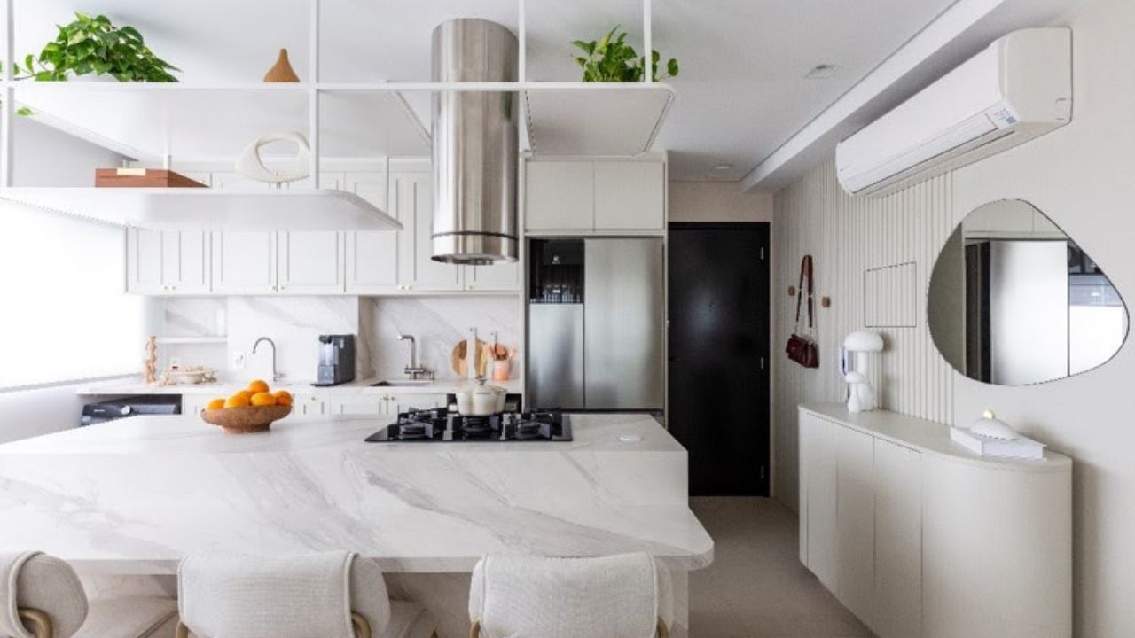 Outro protagonista silencioso do apartamento de 60m² é o tom que reveste grande parte dos ambientes: o branco inspirado no Cloud Dancer, eleito como cor do ano 2026. Longe de ser apenas neutro, esse branco traz uma nuance suave, quase etérea, que amplia visualmente os espaços e cria uma base serena para o restante da decoração. Segundo Mari Milani, a escolha foi estratégica.