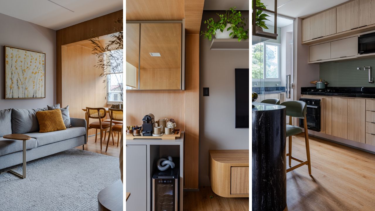 Apartamento de 25 m² ganha amplitude com marcenaria sob medida e decoração afetiva