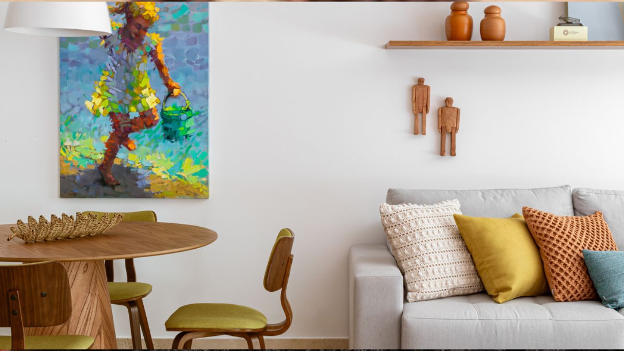 A sala íntima e o pequeno canto de leitura são marcados por obras vibrantes e móveis de linhas puras, resgatando a estética modernista que o morador tanto aprecia. Quadros coloridos, tapetes geométricos e vasos de cerâmica artesanal pontuam o espaço, trazendo energia e movimento sem romper a harmonia.
