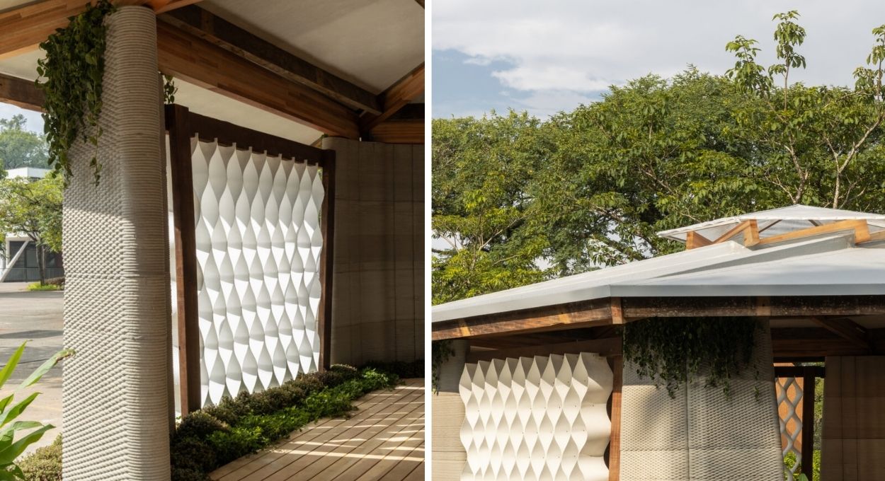 Pilares piramidais de concreto impresso em 3D, interiores ocos para passagem de tubulação e cobogó feito a partir da reciclagem de garrafas PET. Essa não é a descrição de um experimento em laboratório, mas sim de uma casa habitável, erguida no estacionamento ao lado do Pavilhão das Culturas Brasileiras, o Pacubra, no Parque Ibirapuera, em São Paulo. O projeto é assinatura do escritório Superlimão e integra a programação da primeira edição da Bienal de Arquitetura Brasileira, aberta ao público até o dia 30 de abril.