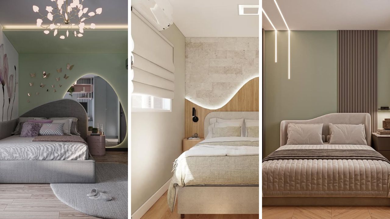 Cabeceira curva transforma o quarto em um refúgio de aconchego e design