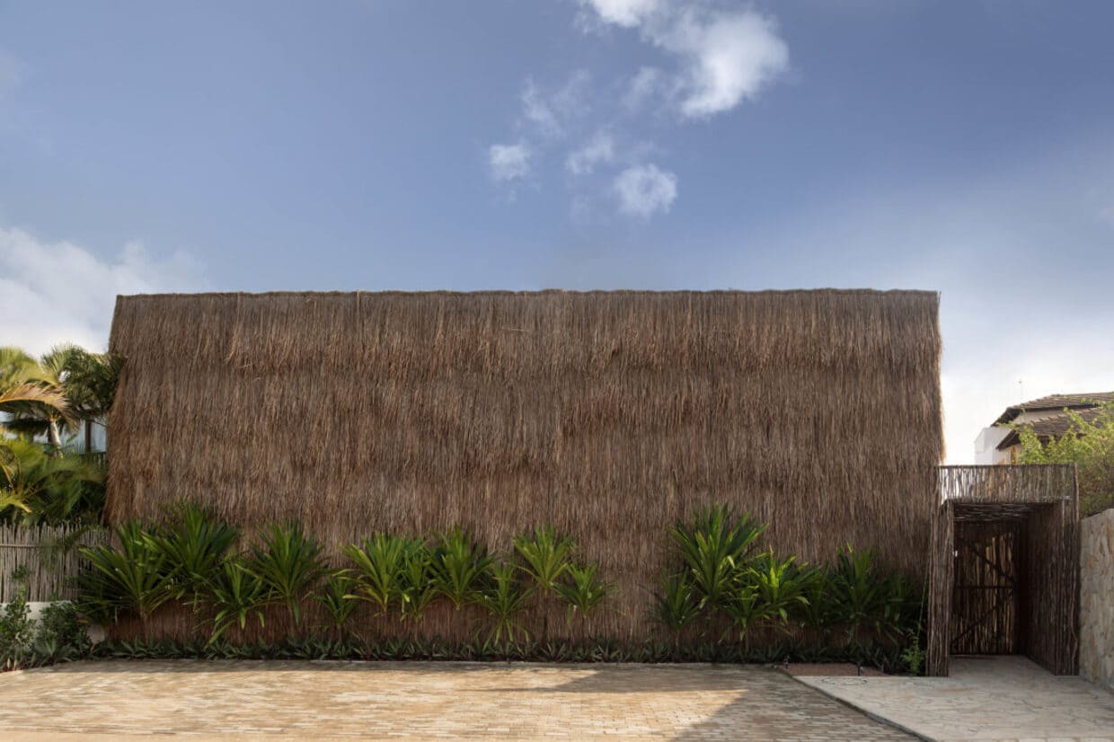 Um dos aspectos mais marcantes da arquitetura da casa de veraneio é a fachada cega totalmente revestida em palha. Além de reforçar a estética rústica e ancestral, esse recurso atua como um filtro visual e térmico, protegendo os interiores e despertando curiosidade já na chegada.