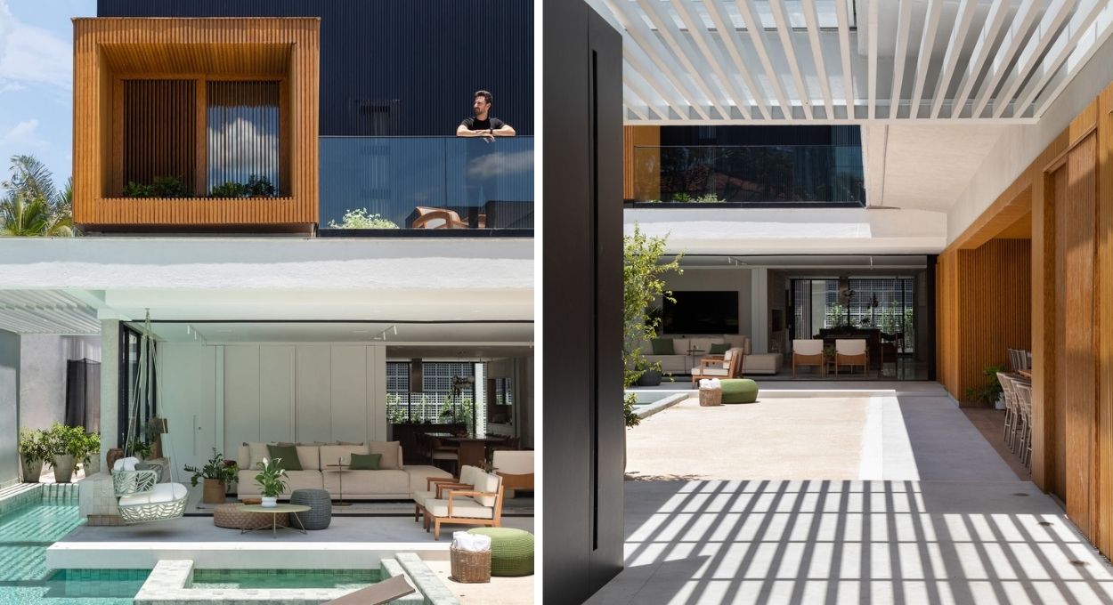 As fachadas combinam painéis ripados de alumínio em três acabamentos distintos (tom de madeira, preto e grafite) criando profundidade visual e evitando a monotonia tão comum em residências que apostam apenas em superfícies lisas.