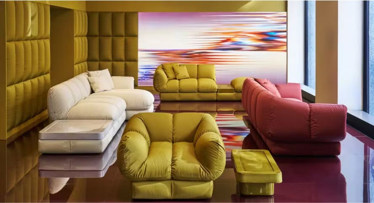 Entre os destaques da coleção está o sistema modular Ardys, assinado pela própria Patricia Urquiola. As costuras profundas e os volumes amplos remetem às jaquetas puffer — uma referência que pode parecer inusitada no universo da decoração de interiores, mas que funciona com precisão técnica: o estofamento combina poliuretano expandido com uma porcentagem de polióis reciclados e uma camada interna de manta de poliéster reutilizado.