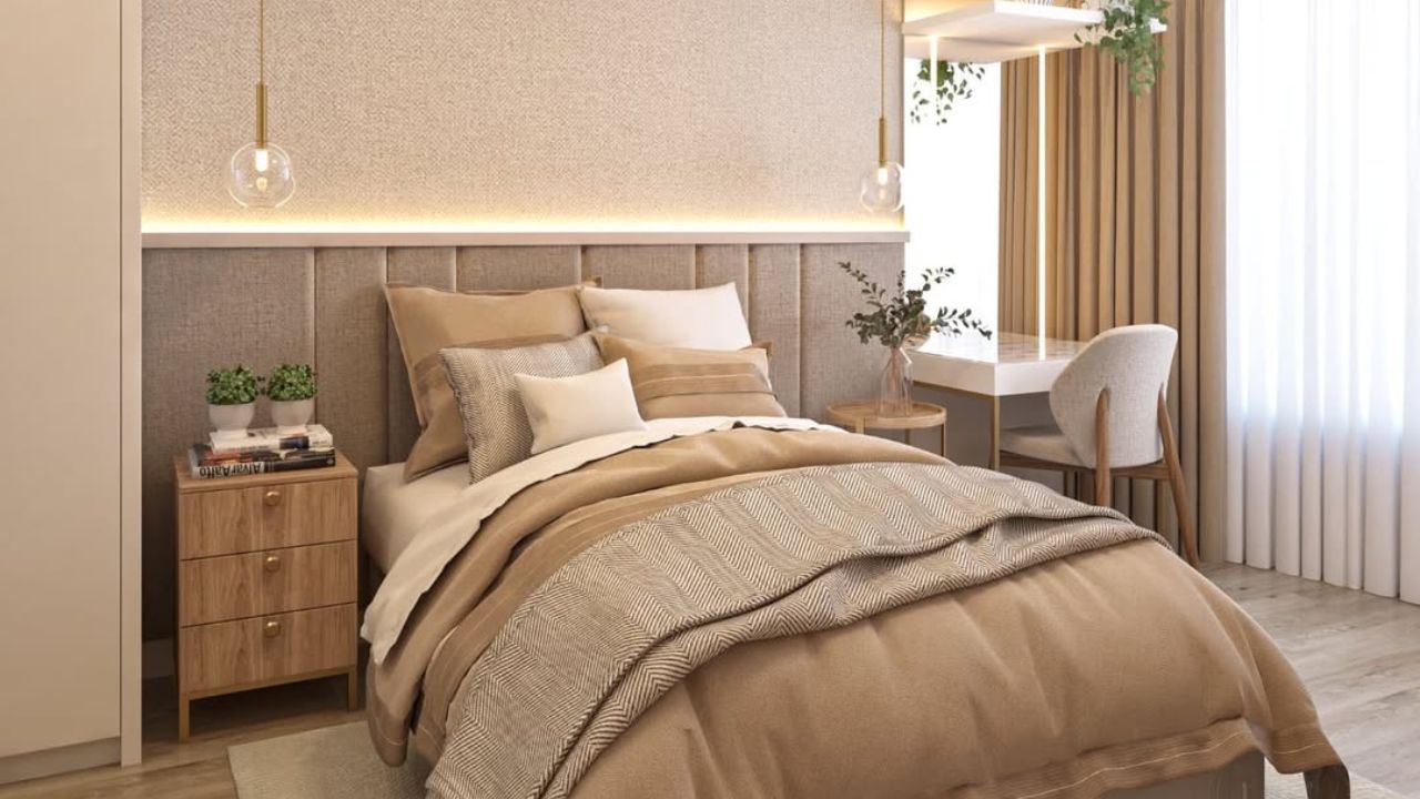 Um refúgio de serenidade e elegância, onde o tom fendi das paredes e a iluminação suave criam uma atmosfera de descanso e cumplicidade. O mix de linho, madeira e luz difusa revela um equilíbrio perfeito entre conforto e design, traduzindo o verdadeiro espírito de um quarto de casal contemporâneo. | Imagem: neohausinteriores