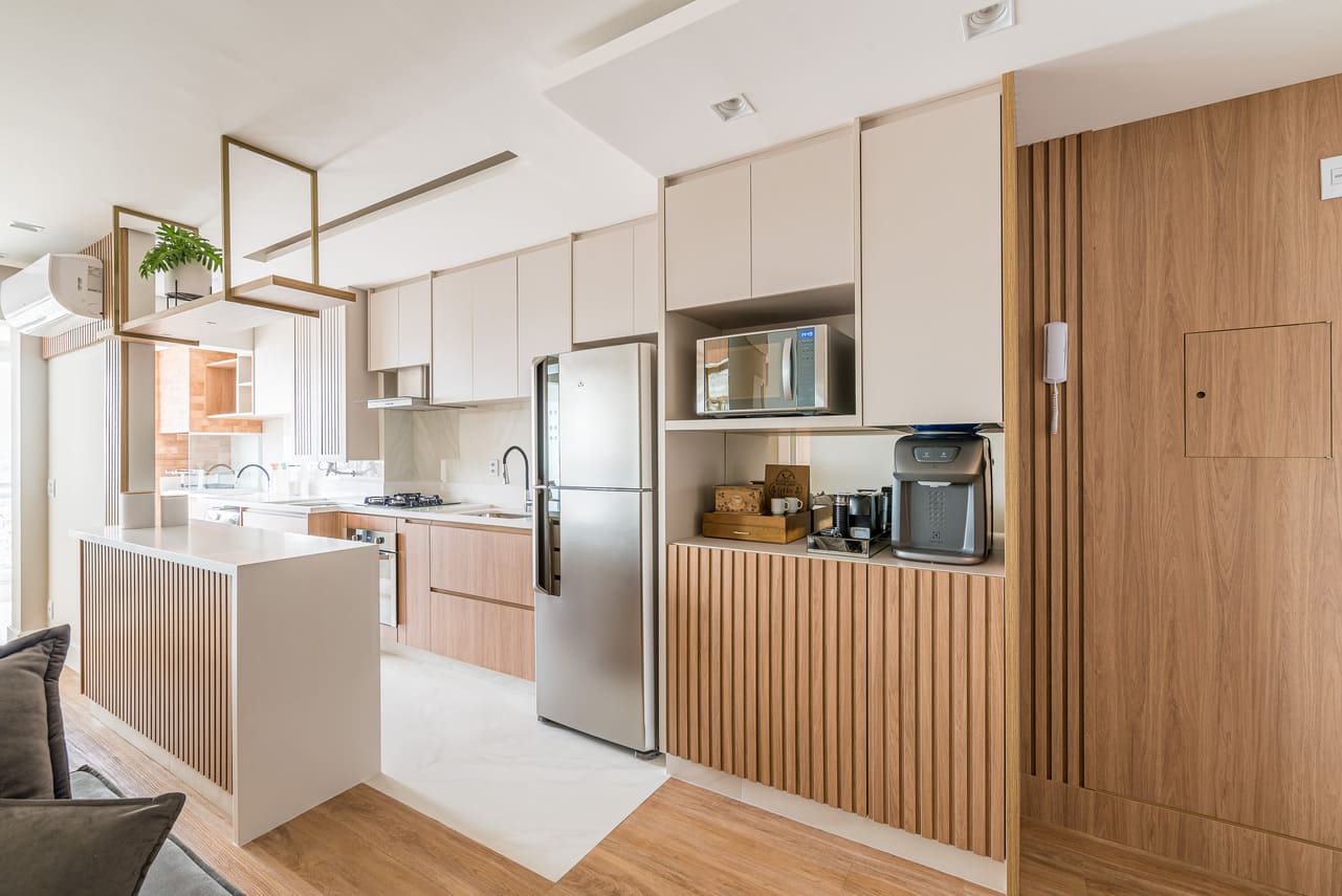 “Eles não são usados com a mesma frequência que uma geladeira ou um fogão. Por isso, podemos nos aproveitar de uma parede vazia para elaborar uma marcenaria de apoio para receber esses itens”, finaliza.