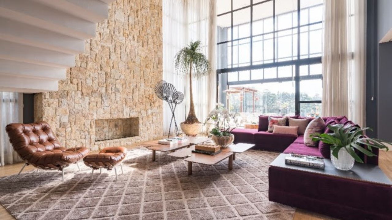 O esplendor e requinte do pé-direito duplo nos remete a história da arquitetura, onde as colunas e palácios possuíam pés muito amplos e buscavam conectar as pessoas com o etéreo. No projeto executado pela arquiteta Ana Rozenblit, do escritório Spaço Interior, a arquitetura do living explora os amplos janelões de vidro e a beleza da parede revestida em pedra | Foto: Kadu Lopes