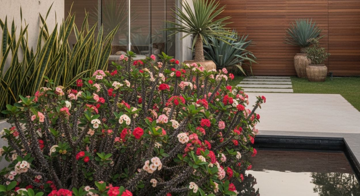 O que percebemos nos projetos que usam bem a coroa-de-cristo é que a planta raramente aparece sozinha. Ela funciona em grupo, em repetição rítmica ao longo de um canteiro ou como elemento de transição entre massas vegetais maiores. Quando bem posicionada, ela não precisa de muito espaço para marcar presença — e essa é uma das razões pelas quais o paisagismo com plantas resistentes continua sendo uma das apostas mais inteligentes para os jardins brasileiros.