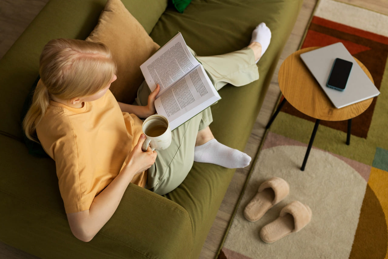 Já os móveis devem unir funcionalidade e estética. Uma poltrona com encosto reclinável, almofadas generosas e uma manta de tricô ajudam a criar a ambientação ideal. Ao lado, uma mesinha de apoio permite acomodar o livro da vez, uma xícara de chá ou um difusor de aromas.
