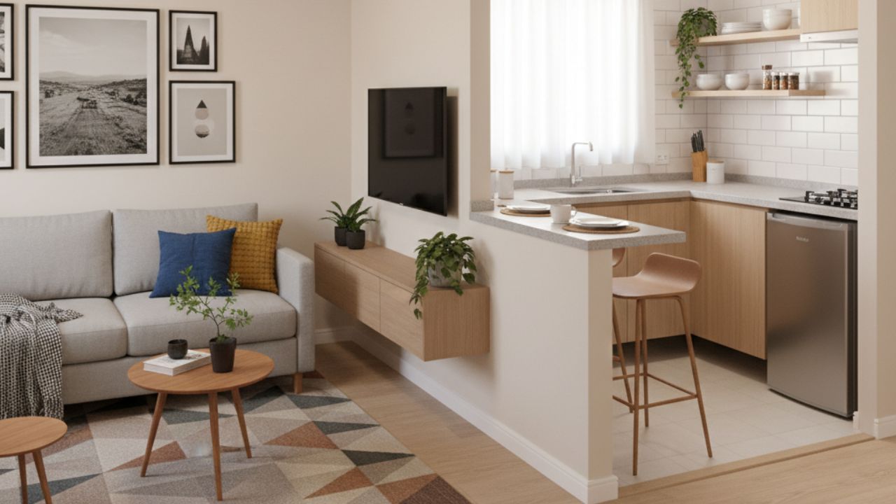 A bancada americana vira o grande divisor: ela pode ser estreita, mas com profundidade suficiente para refeições rápidas, e ainda servir de apoio para plantas ou objetos decorativos. Marcy Ricciardi, arquiteta especializada em espaços compactos, alerta: “o tapete deve ser proporcional ao sofá – grande demais ‘come’ o espaço, pequeno demais faz o ambiente parecer ainda menor”. Escolha um tapete que delimite a área de estar sem invadir o caminho da cozinha.