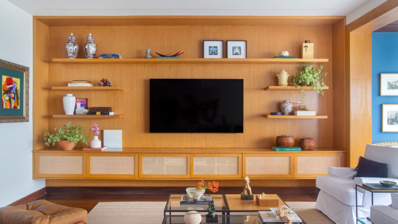 Poucos itens novos foram incorporados ao décor, e essa escolha foi intencional. A poltrona da sala, a mesa de centro e a marcenaria sob medida em freijó, com portas em palha natural, surgem como complementos discretos, pensados para dialogar com o que já existia.