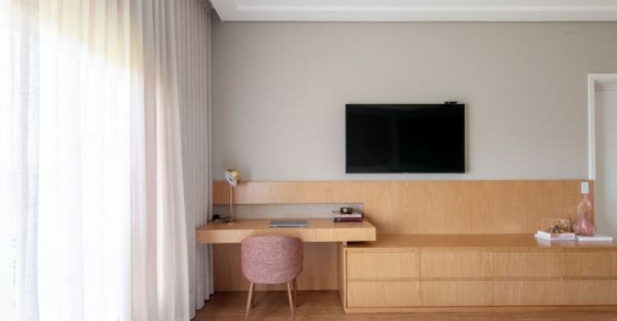 A dupla função escrivaninha-penteadeira virou tendência em dormitórios. Com um espelho bem posicionado e iluminação lateral, a mesma bancada que acolhe o laptop durante o dia vira estação de beleza à noite. As arquitetas Vanessa e Claudia exploram essa ideia em projetos onde o espaço é disputado. Ao embutir a escrivaninha na marcenaria do closet ou guarda-roupa, criam um móvel híbrido que atende múltiplas funções sem competir com os outros elementos do quarto.