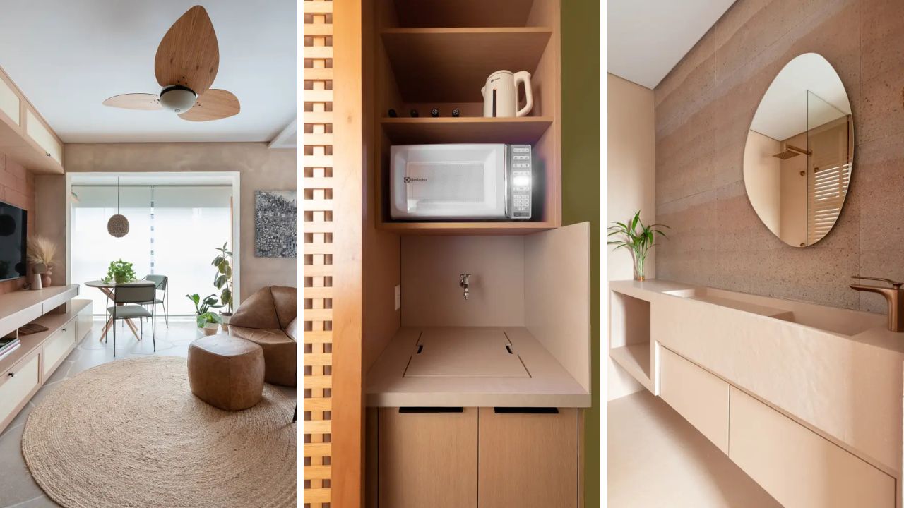 Segundo Renata Ferrão, a ideia foi trabalhar com transições suaves. “Em espaços compactos, a arquitetura precisa ser quase invisível. Optamos por delimitar funções sem criar bloqueios visuais, deixando que os materiais e as texturas conduzissem o olhar”, explica a arquiteta, destacando a importância de pensar o layout como um percurso contínuo.