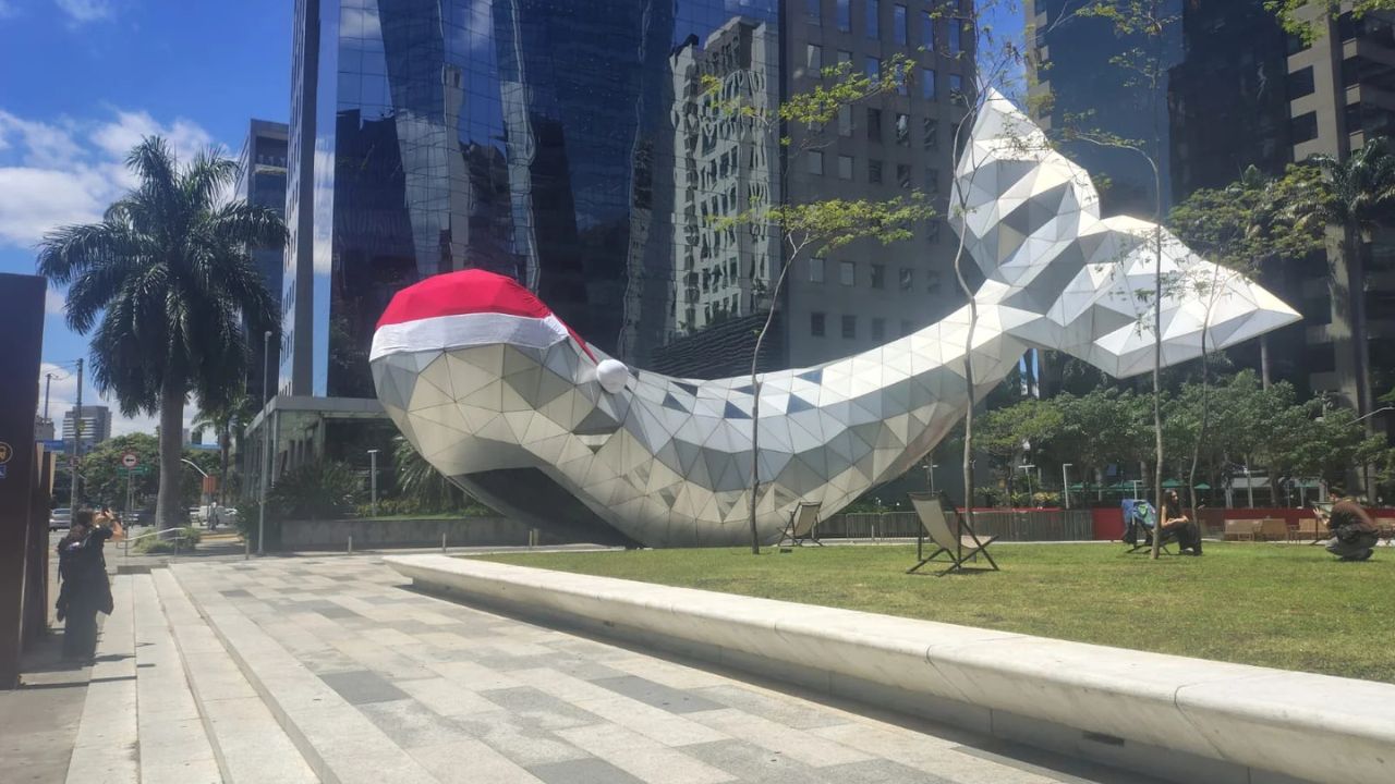 Mas foi o gorro vermelho, instalado como parte da decoração de fim de ano, que transformou a baleia em celebridade temporária. A imagem viralizou instantaneamente. Em poucos dias, a obra ganhou vida própria nas redes, virou personagem de memes, rendeu comparações divertidas e inspirou até debates sobre intervenções artísticas em espaços corporativos.