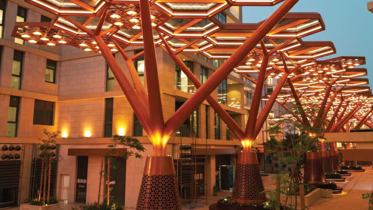 A estrutura que torna tudo isso possível é também a mais visualmente impactante do projeto. Dezenas de “árvores” artificiais foram erguidas ao longo do percurso, cada uma formada por 10 mil toneladas de cristal no total — material escolhido justamente pela sua capacidade de reter o calor solar antes que ele chegue ao nível dos transeuntes. A cobertura filtra a radiação, cria sombra densa e ainda garante um jogo de luz que muda conforme o sol se movimenta.