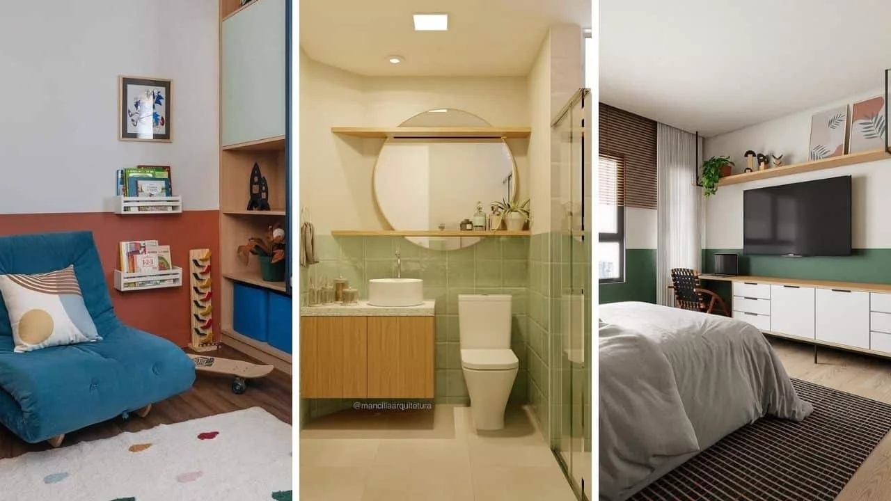 Em cozinhas, lavabos e banheiros, por exemplo, revestimentos cerâmicos na parte inferior protegem contra a umidade e facilitam a limpeza, enquanto a porção superior pode receber uma pintura mais delicada. Já em salas e quartos, a madeira ou a serralheria leve na metade inferior adicionam calor e rusticidade, favorecendo ambientes com personalidade.