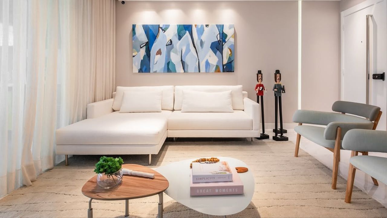 Uma das maiores qualidades da mesa de centro é sua capacidade de criar harmonia entre o sofá, as poltronas e o tapete. Quando bem dimensionada, ela atua como ponto focal, equilibrando o peso visual do ambiente e trazendo proporção. Isso é especialmente importante em salas integradas, onde os ambientes precisam conversar sem perder sua identidade. A arquiteta recomenda atenção às medidas: “A peça deve ter altura compatível com o assento do sofá e espaço de circulação confortável em volta, de pelo menos 60 cm.”