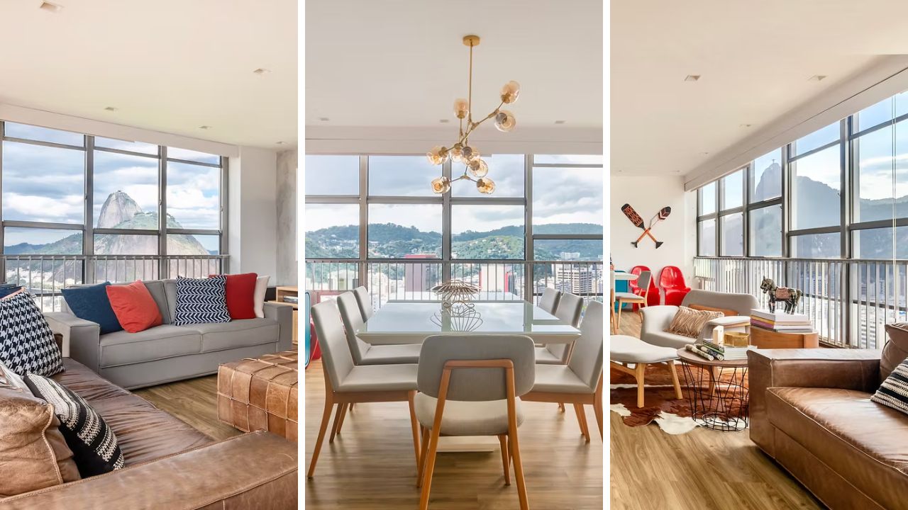 A ampla sala em “L”, totalmente envidraçada do piso ao teto, não permite decisões tímidas. O enquadramento inclui Pão de Açúcar, Baía de Guanabara, orla de Botafogo e Flamengo, Niterói e o Cristo Redentor. Diante disso, qualquer elemento interno precisa dialogar com a paisagem — nunca competir com ela.
