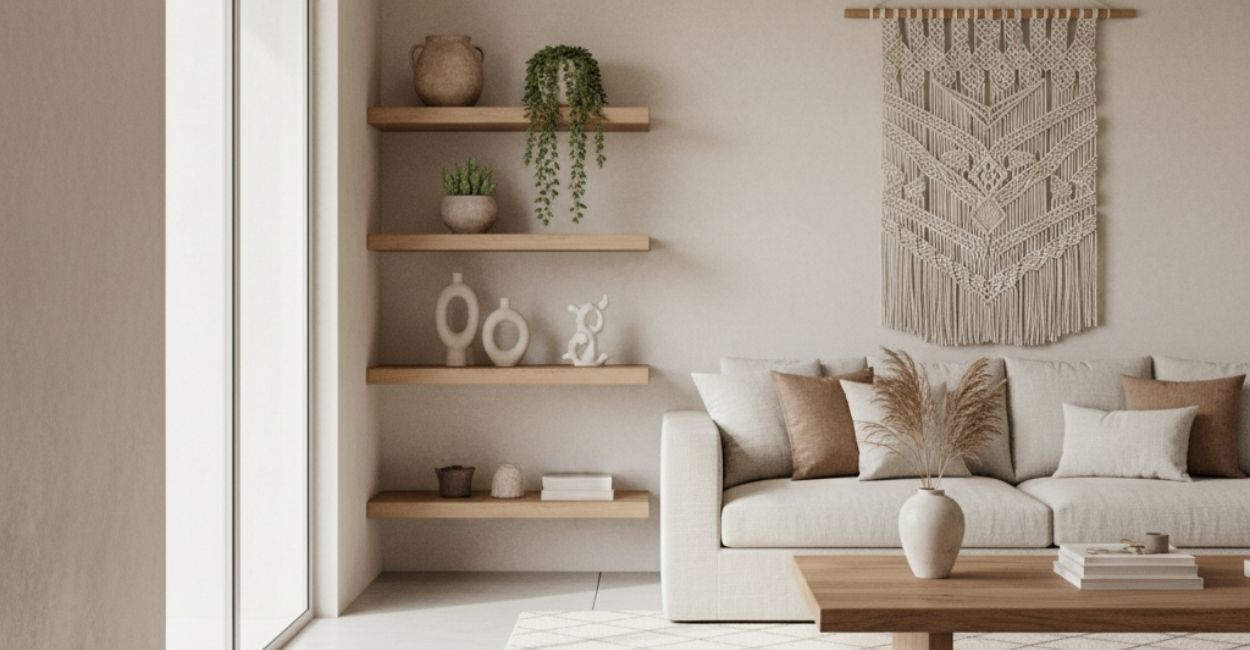 Sala de estar monocromática em tons bege e madeira natural, com sofá bege, mesa de centro de madeira, planta costela-de-adão em vaso cerâmico, tapete texturizado e estante com objetos decorativos artesanais.