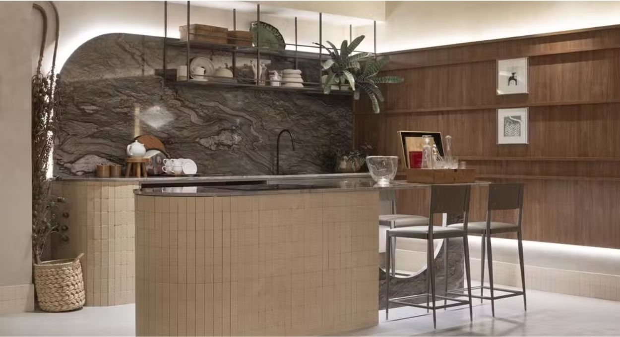 Paulo Valente cria um living onde a memória narrativa ganha materialidade. Pedras naturais e madeira compõem a base do projeto, que tem a adega como elemento central e simbólico. A referência ao vinho não é casual: o processo de amadurecimento, transformação e valorização com o tempo é exatamente o que o tema propõe.
