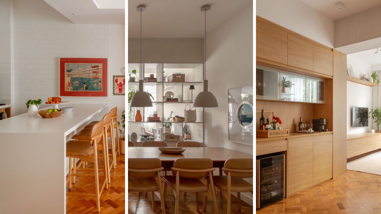 Manter o piso original foi um dos maiores desafios da obra, exigindo técnica e cuidado durante a execução. “A recuperação do taco de peroba-do-campo demandou dedicação, mas foi essencial para preservar a identidade do apartamento e garantir um resultado estético consistente”, finaliza Paula Müller.
