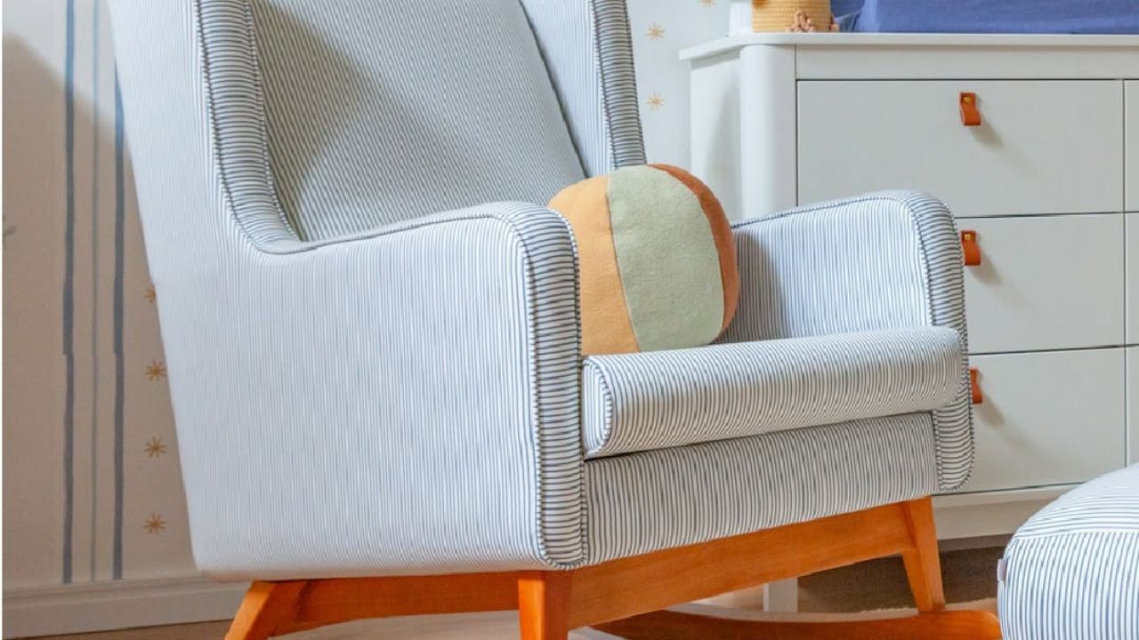 A poltrona de amamentação clássica traz encosto alto, braços estruturados e, muitas vezes, acompanha puff de apoio para os pés. Funciona bem em projetos mais atemporais ou em quartos com marcenaria tradicional.