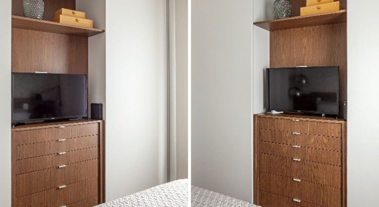 Considerando que a cama ocupa o espaço adequado, a execução do armário precisa incluir medidas que assegurem a funcionalidade das gavetas e o manuseio dos acessórios em seu interior. A profissional ressalta: “Quando falamos de cabides, precisamos, minimamente, de 60cm livres”, orienta. Ainda de acordo com sua experiência, gavetas menos profundas facilitam a adequação do móvel sem prejudicar o tráfego dos moradores no quarto.