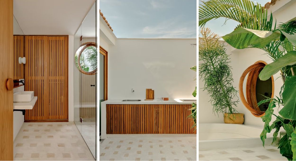 O trabalho de Pedro Rabelais no terraço não é apenas decorativo, ele é estrutural para o conceito da cobertura. Espécies tropicais de diferentes alturas criam camadas de verde que chegam até as janelas redondas do banheiro, onde uma sauna foi instalada dentro do boxe.
