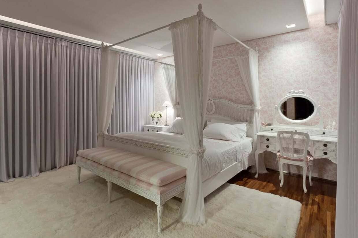 Para a arquiteta Bia Prado, o segredo está na forma como o elemento é integrado ao contexto do quarto. “Você pode trazer o dossel com uma pegada mais contemporânea, usando tecido tensionado ou apenas marcando o contorno superior com iluminação embutida, criando uma leitura leve, quase flutuante. Já em quartos infantis, o dossel ajuda a criar um microcosmo lúdico e acolhedor, sem pesar na composição.”