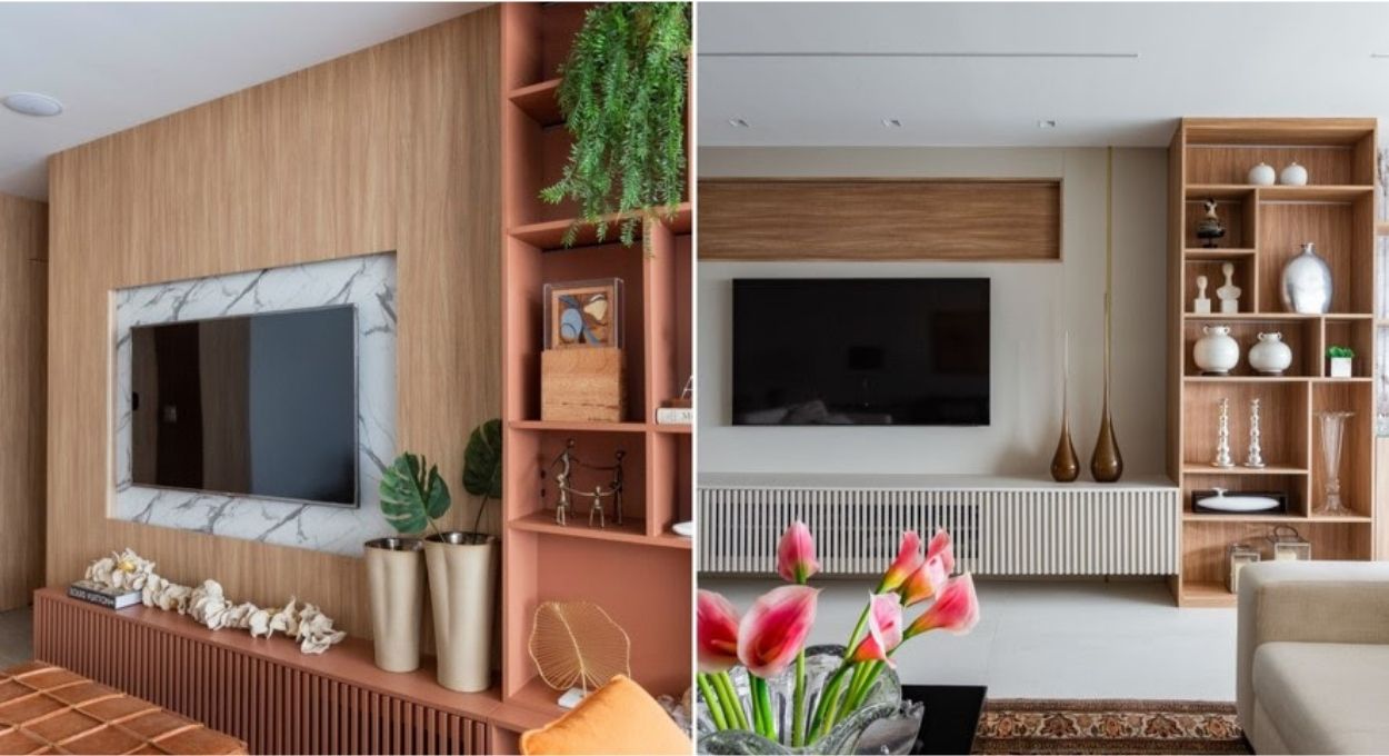 Daniela Funari executou projetos onde o rack suspenso ocupa quase metade da parede, criando nichos estratégicos para diferentes finalidades. Em um deles, a marcenaria foi “dividida” visualmente: a parte inferior mais baixa acomoda os eletrônicos, enquanto a extensão lateral, mais alta, funciona como estante. Para completar, um carrinho de chá ao lado cria um cantinho de bar integrado à sala.