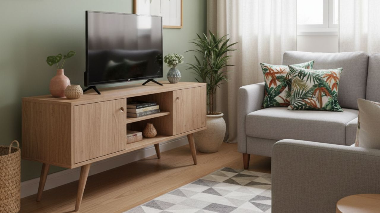 Dica de Ouro: Observe como a luz natural incide no rack durante o fim da tarde. Pés inclinados criam sombras diagonais no piso, e essa leitura pode valorizar ou prejudicar o conjunto. Se o ambiente recebe luz lateral intensa, prefira madeira de tom médio, que absorve melhor o contraste e evita reflexos excessivos.