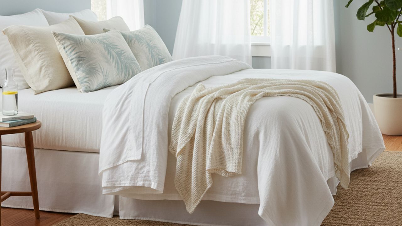 Assim, a cama de verão ganha camadas mínimas, com materiais que permitem à pele respirar livremente, reduzindo aquela sensação incômoda de calor acumulado. Além disso, tons claros e texturas naturais elevam o visual, criando um refúgio que parece saído de uma revista de decoração.