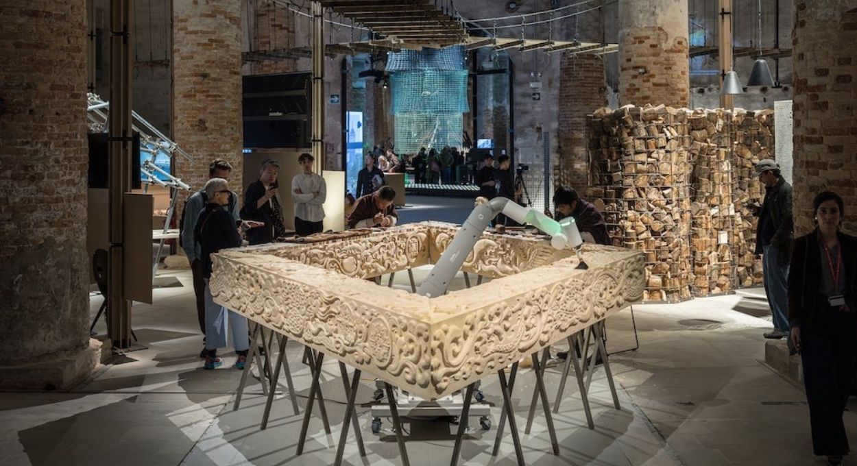 Visible Co-Work apresenta a colaboração entre IA e humano como modelo criativo. A instalação Ancient Future, do BIG, onde um robô e um artesão esculpem simultaneamente a mesma peça, sintetiza essa convivência entre tempos e inteligências. No design latino-americano, marcas colombianas e mexicanas já combinam processos industriais com acabamento manual como diferencial competitivo. Escritórios brasileiros exploram essa fricção ao integrar fabricação digital com soluções artesanais — seja em elementos vazados por corte CNC, seja na combinação entre estrutura industrial e acabamento manual, onde o processo em si passa a fazer parte do resultado.
