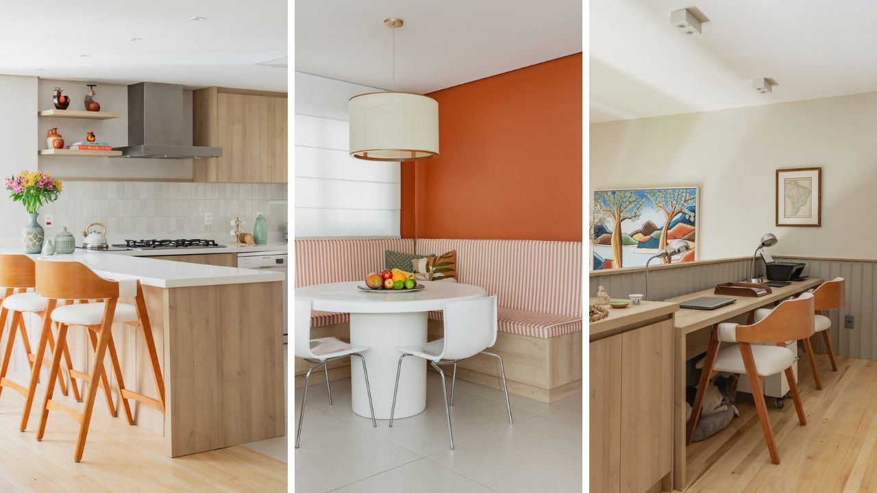 A base estética do projeto aposta em tons off-white, revestimentos amadeirados e elementos que remetem à natureza para criar uma atmosfera calma e contemporânea. Mas é na escolha dos detalhes — como o tom terracota que reveste parte da parede e do mobiliário no canto alemão — que a personalidade do espaço realmente se revela.